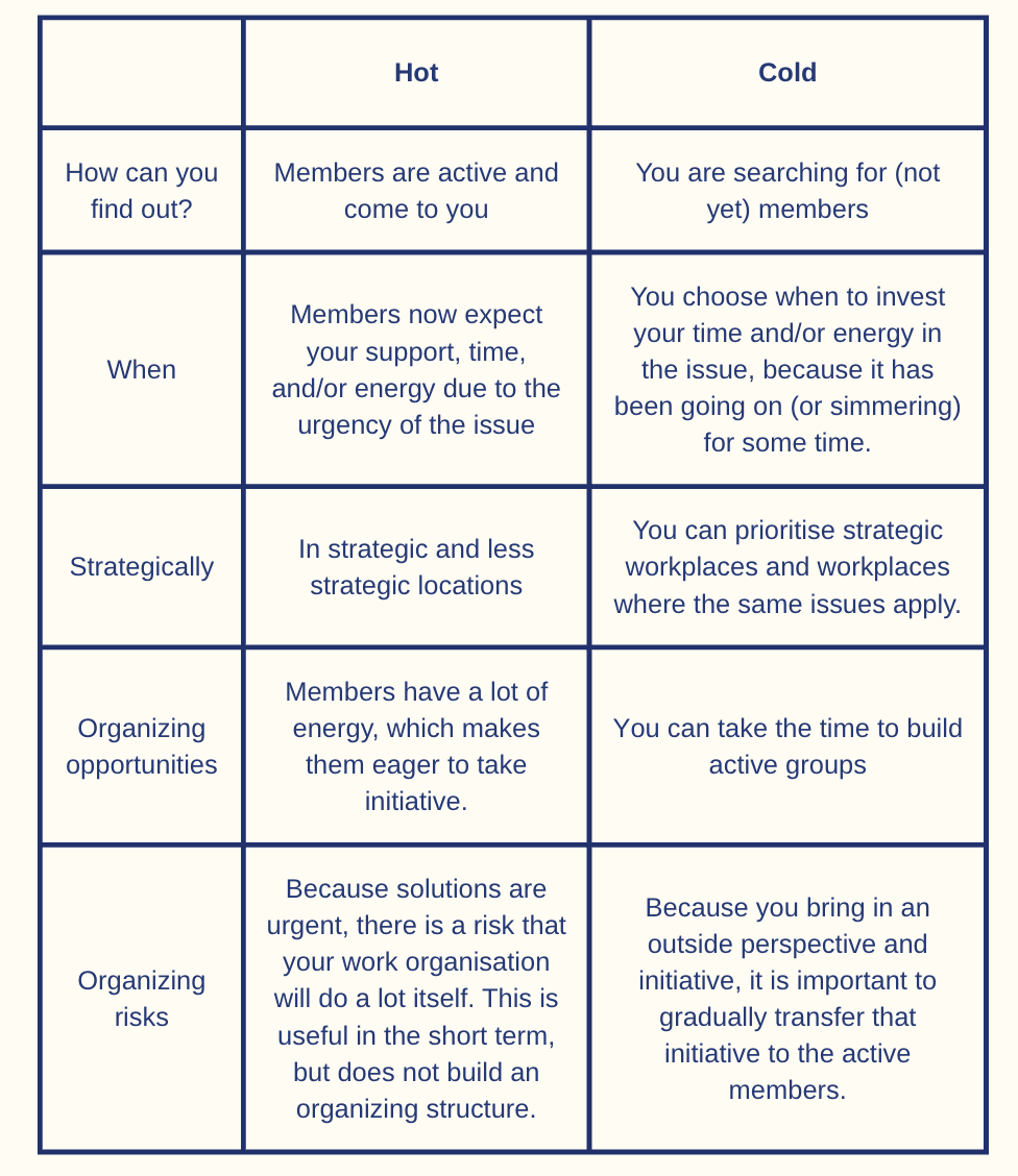 It is also possible that an issue is not BOND because it will only emerge in the future, is not solvable, or does not evoke strong emotion. This does not mean your organisation cannot lobby for it, research it, or simply monitor it. Hot issues and cold issuesWithin the issues that qualify as BOND, a distinction can be made between “hot” and “cold” issues. Simply put, hot issues are urgent, high-intensity problems that people come to you about immediately, while cold issues are those that simmer in the background but, due to a lack of initiative or perspective, have not yet led to tangible change. An example of a “hot” issue is sudden budget cuts that threaten layoffs. Everyone is in a state of alarm and discussing it. Irreversible steps may happen quickly, so there isn’t time to calmly build your campaign structure, it must be addressed immediately. To clarify the difference, we provide a list of examples below. |