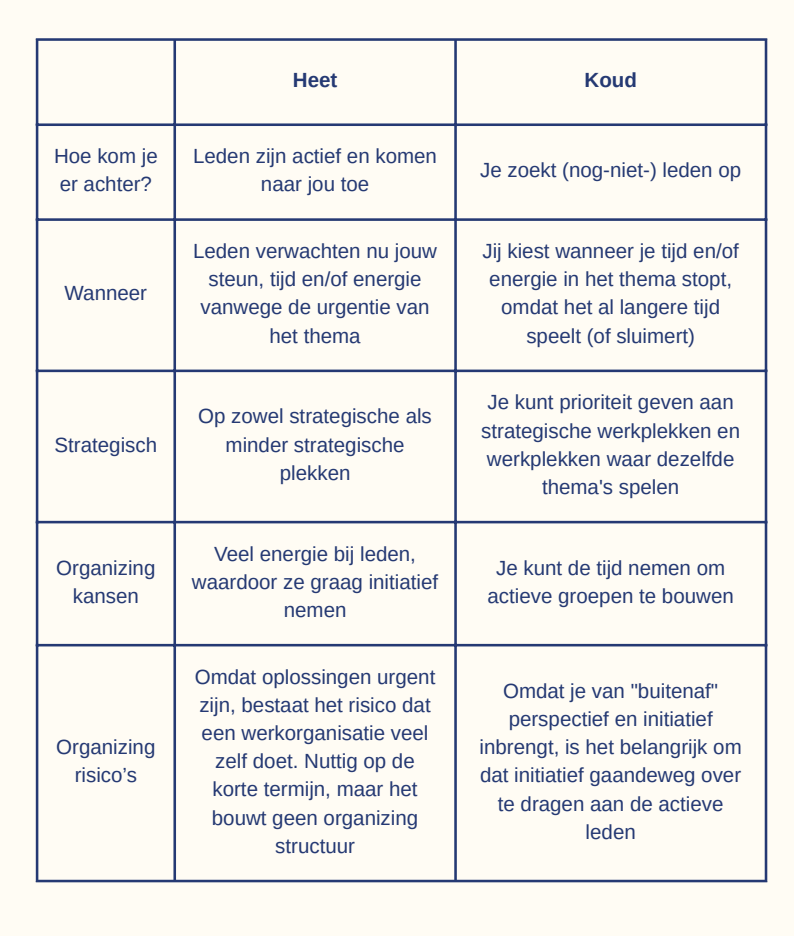 Het is ook voorstelbaar dat een issue niet BOND is omdat het zich pas in de toekomst gaat afspelen, niet oplosbaar is of geen emotie opwekt. Dat hoeft niet te betekenen dat je organisatie er geen lobby op voert, geen onderzoek naar doet of het issue helemaal laat liggen. Hete issues en koude issuesBinnen de thema's die BOND zijn, is er een onderscheid te maken tussen 'hete' en 'koude' issues. Kort gezegd zijn hete issues de uitslaande branden waar mensen op stel en sprong mee aan komen zetten en zijn koude issues de thema's die al sluimeren, maar waardoor een gebrek aan initiatief of perspectief het nog niet lukt om verandering te realiseren. Een voorbeeld van een ‘heet’ issue, zijn acute bezuinigingen waardoor ontslagen dreigen. Iedereen is in rep en roer en heeft het erover. Onomkeerbare stappen dreigen snel, dus heb je niet de tijd om rustig te bouwen aan je campagne structuur: het moet direct worden opgepakt. Om het verschil te verduidelijken geven we hieronder een rijtje met voorbeelden. |
